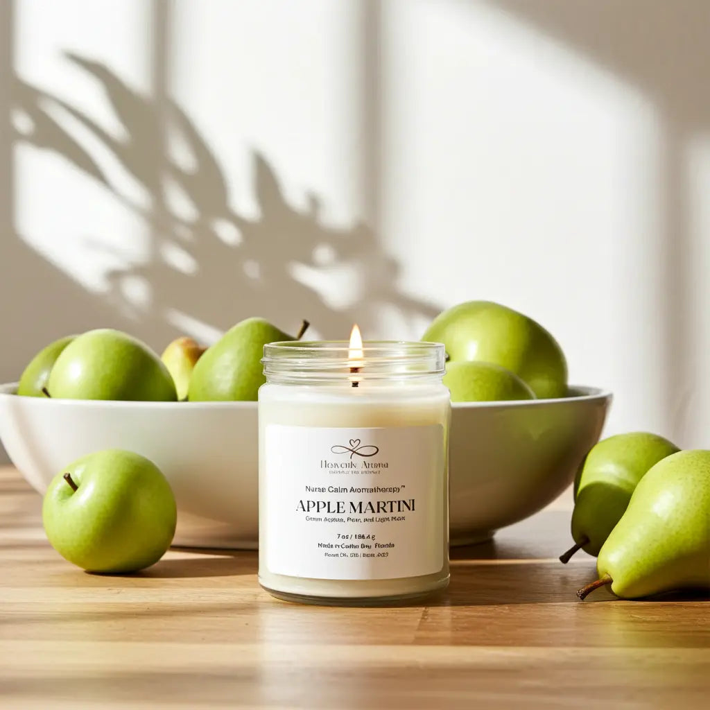 Candle jar labeled 'Apple Martini' with green apples and pears on a neutral background